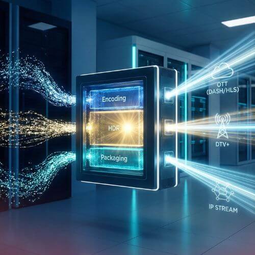 Ele combina codificação de alta performance, processamento HDR, empacotamento OTT (DASH, HLS, CMAF) e suporte a ambientes como ATSC 3.0 / DTV+ e infraestruturas IP modernas.